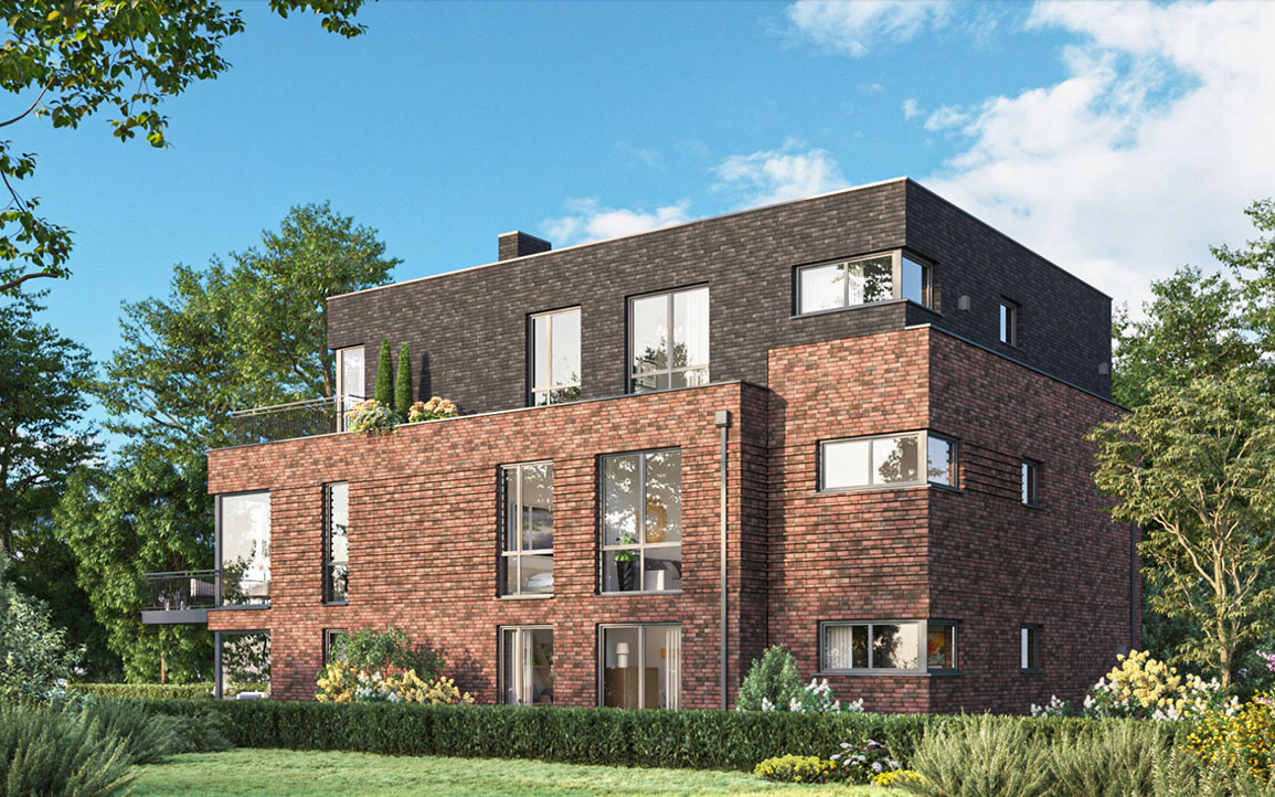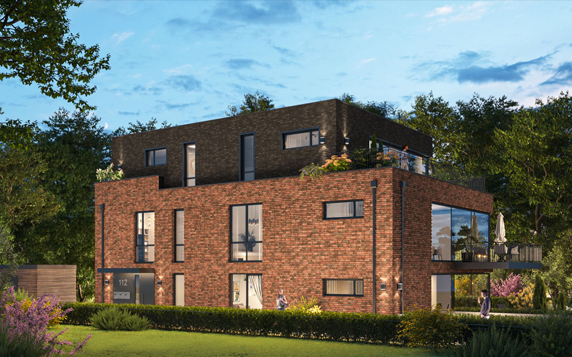 Je nach Bedarf bietet EDEN seinen Bewohner*innen gleich zwei Zugänge: Über die südliche Hauptzufahrt am Othmarscher Kirchenweg 112 fährt man bequem in die hauseigene Tiefgarage. Wahlweise lässt sich das Grundstück aber auch über den östlichen Fußweg der sich von Nord- bis Südeingang über die Grundstückslänge erstreckt, betreten. Kommend vom Nordeingang am Schwartenkamp, erreicht man den blickgeschützten Hauseingang, den diskrreten, eingehausten Müllplatz sowie die Radgarage, die bereits für E-Ladestationen vorgerüstet ist. Apropos perspektivisch: Das gesamte Haus öffnet sich mit seinen großzügigen, bodentiefen Fensterfronten , Balkonen und Terrassen gen Südwesten – und gibt dank der niedrigen Rundumbebauung einen spektakulären Blick frei.