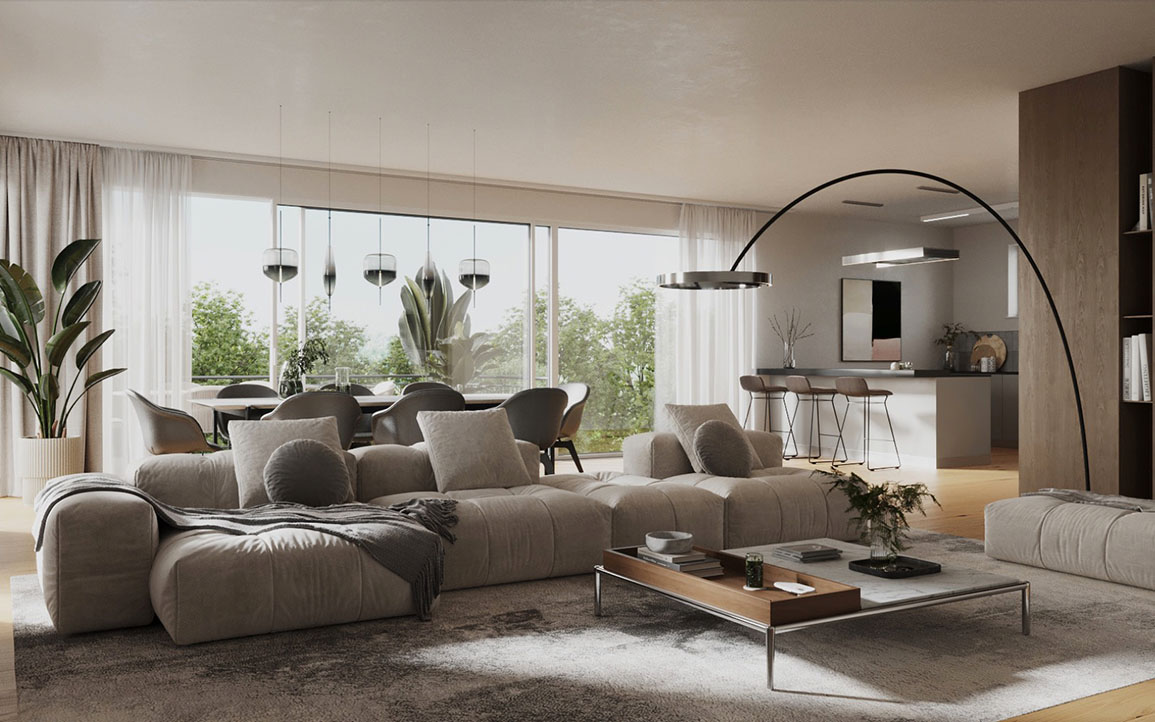 Schon bei der Anfahrt wird klar: Jeder Zentimeter der 890 m² großen EDEN-Grundstücks wurde für höchste Ansprüche designt. So gehören zu jeder der drei Eigentumswohnungen à 120m² bis 163m² (3-4 Zimmer) gleich zwei Tiefgaragenstellplätze.